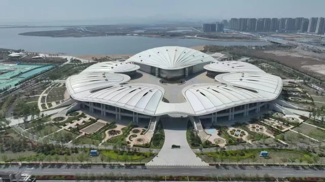 Situé dans la zone de démonstration de Qingdao SCO, le magnifique centre d'exposition SCO Pearl laisse une impression durable le long du lac Ruyi. Vue d'en haut, sa conception circulaire inspirée de "Unity" comprend sept toits blancs en forme de coquille interconnectés disposés radialement. Ils créent des vagues rythmiques et ondulées qui s'élèvent avec élégance vers le ciel.