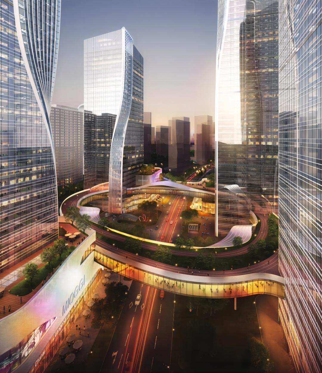 Ce complexe à double tour couvre 57 acres avec une superficie totale de 220 000 m², intégrant les bureaux, les hôtels, la vente au détail, la restauration et le divertissement. Ses murs-rideaux en verre, ornés de plus de 7 200 mètres de bandes lumineuses synchronisées, créent des motifs dynamiques sur près de 11 000 m², offrant un puissant impact visuel.