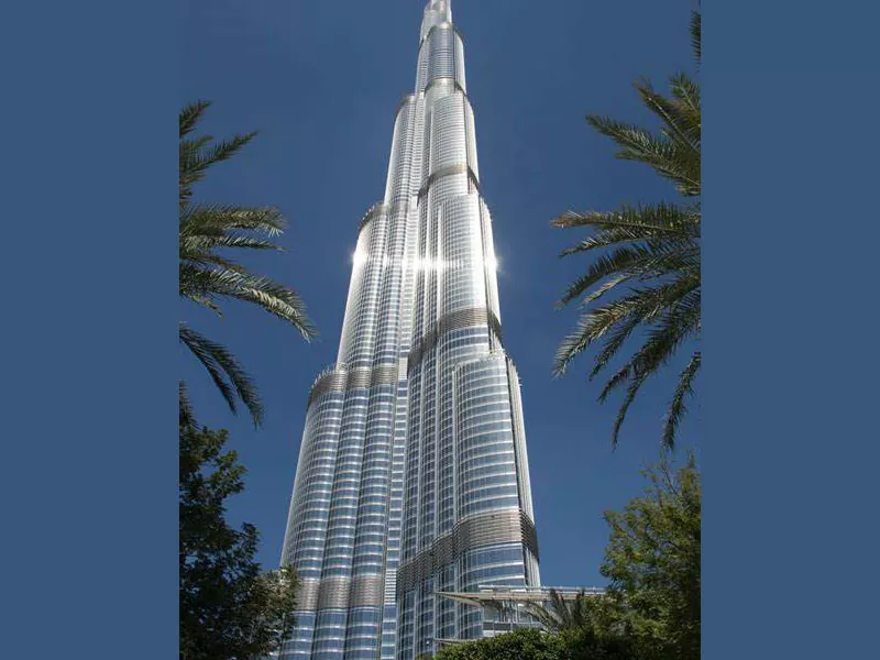 ● Le Burj Khalifa à Dubaï, Émirats arabes unis, est le plus haut bâtiment du monde, avec un cadre hybride en béton en acier. Il s'élève à 163 étages et plus de 828 mètres de haut.